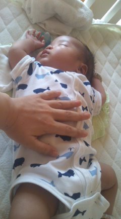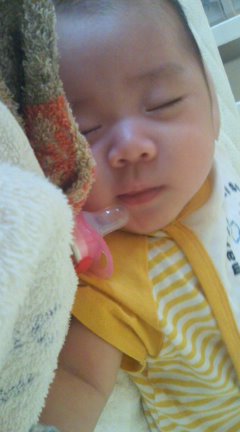写ってるのは長男・はじめです。これでも三人の中では一番大きくて、重たかったです。周囲が騒がしくてもぐっすり寝てるところとか、大物になりそうな予感。